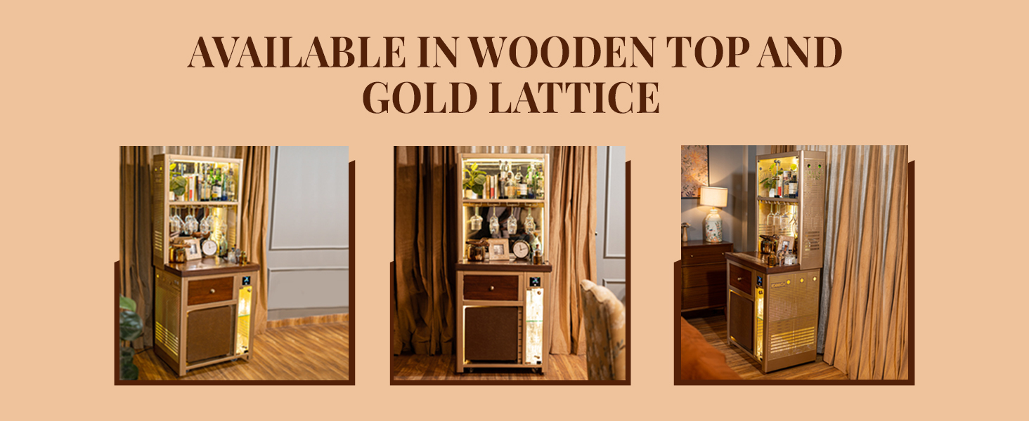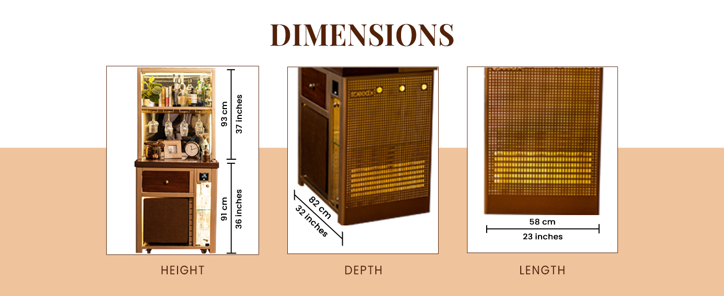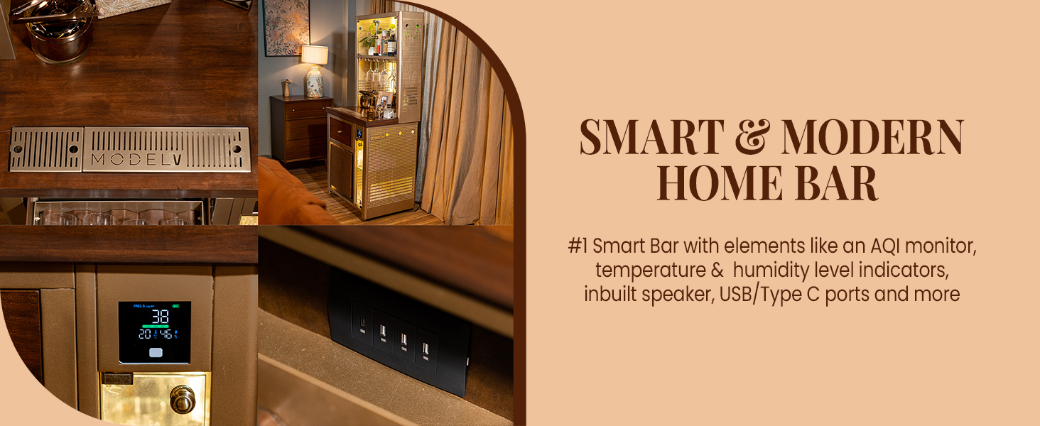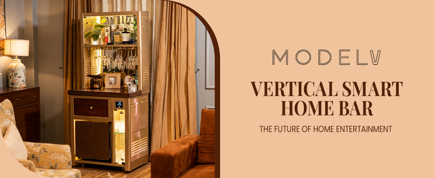 Model V Home Bar is a Stylish and Space-efficient solution for compact spaces. It is our first smart bar with elements like an AQI monitor, temperature sensors, humidity level indicators, inbuilt speaker, multiple charging ports and more. Model V is a great addition for showcasing your spirits and creating a cozy atmosphere for entertaining your guests or enjoying a quiet drink at home. Its attractive top-mounted backlit display cabinet stacks up to 14 to 15 bottles alongside glasses or books, while the hanging rails cater to wine/cocktail glasses (up to 12 glasses). Its front glass display, which holds up to 24 glasses, adds a touch of modern flair, making it the perfect centerpiece for any space and it doubles as a cocktail station, featuring slots for an ice bucket and drip tray on top. With stylish perforated lattice design with LED lights on both sides, Model V is the epitome of modern elegance and our very first Vertical Bar!