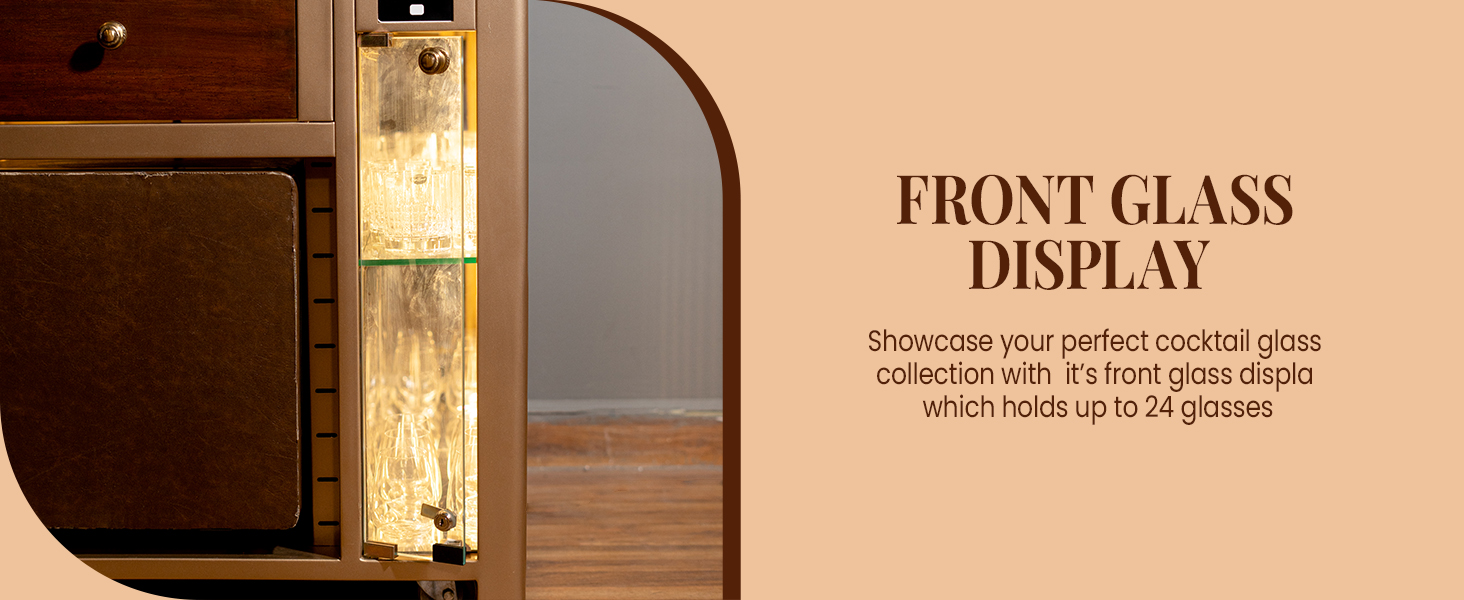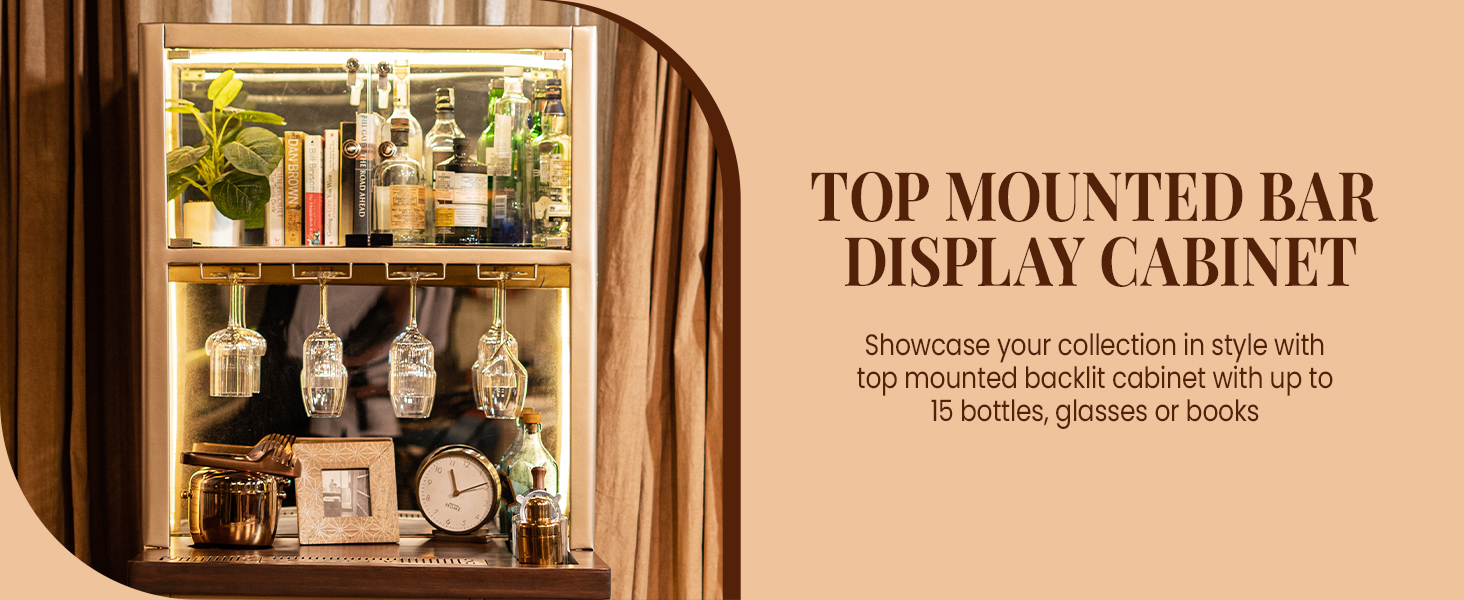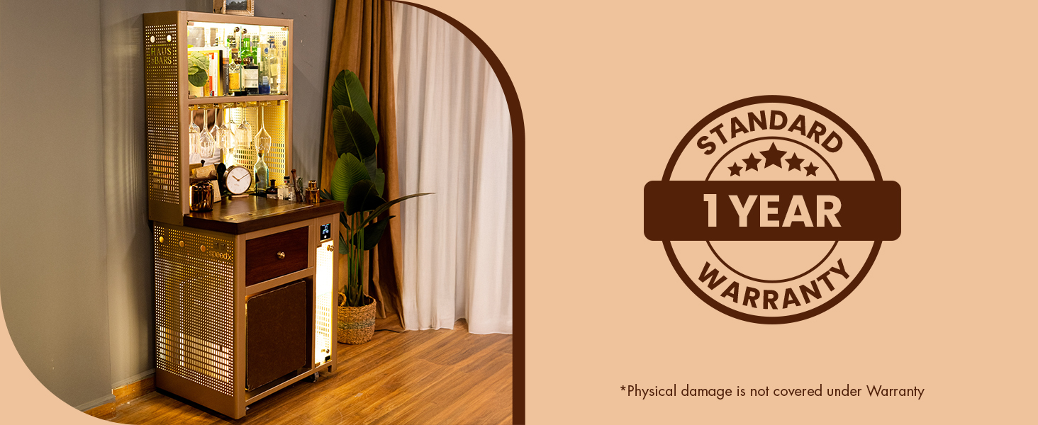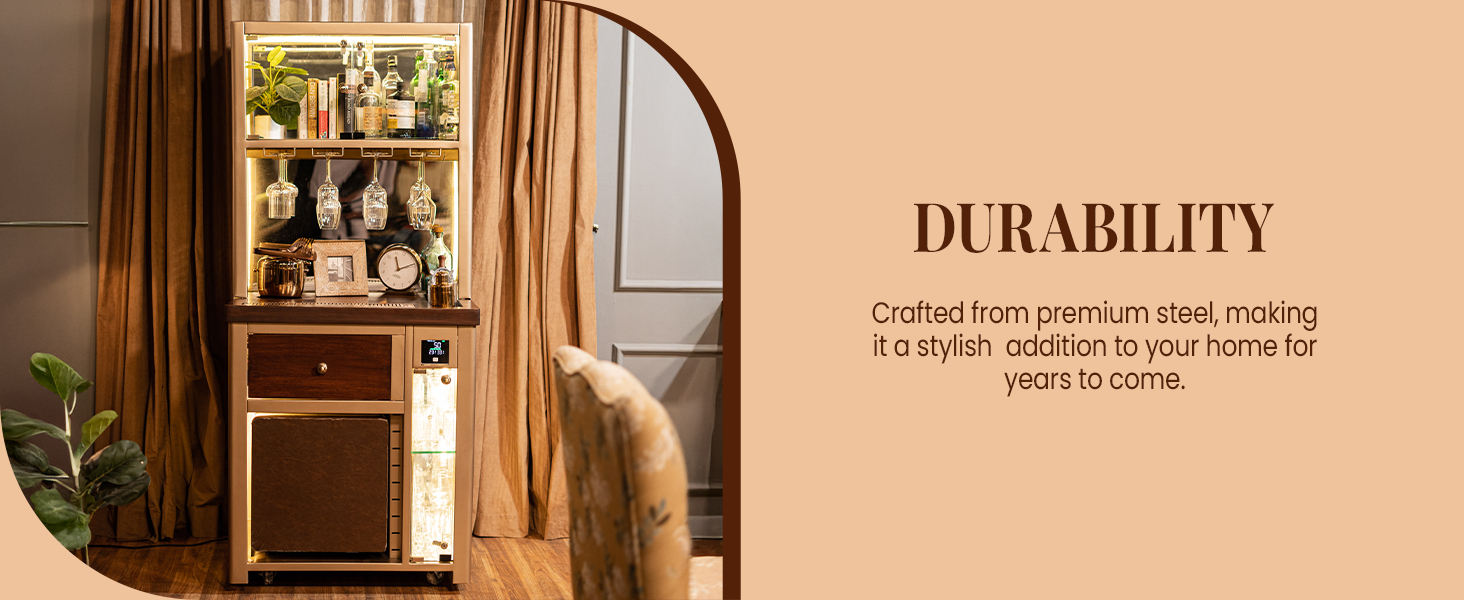 Model V Home Bar is a Stylish and Space-efficient solution for compact spaces. It is our first smart bar with elements like an AQI monitor, temperature sensors, humidity level indicators, inbuilt speaker, multiple charging ports and more. Model V is a great addition for showcasing your spirits and creating a cozy atmosphere for entertaining your guests or enjoying a quiet drink at home. Its attractive top-mounted backlit display cabinet stacks up to 14 to 15 bottles alongside glasses or books, while the hanging rails cater to wine/cocktail glasses (up to 12 glasses). Its front glass display, which holds up to 24 glasses, adds a touch of modern flair, making it the perfect centerpiece for any space and it doubles as a cocktail station, featuring slots for an ice bucket and drip tray on top. With stylish perforated lattice design with LED lights on both sides, Model V is the epitome of modern elegance and our very first Vertical Bar!