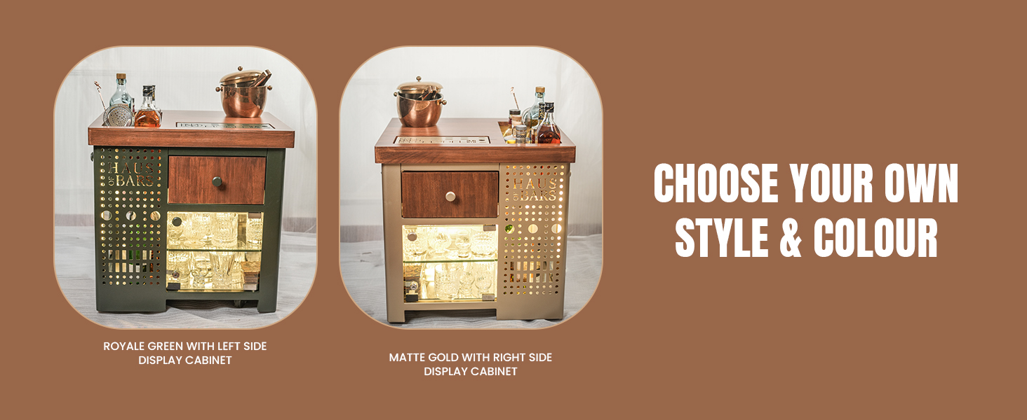 Model M is the OG Mini bar with a refreshing modern age twist. Designed and built for modern Indian homes, with a keen eye on space utilisation. This bar can be placed besides a sofa or a lounge chair or against a wall. Model M is on wheels and thus enabling you to roll it across your home, absolutely anywhere. It allows you to make a drink while seated in the comfort of your chair. This bar comes with a display cabinet that can store 8-10 bottles of alcohol(Including Speed Rail). The top row of this cabinet is open from top, for easy bottle access while making a drink.
