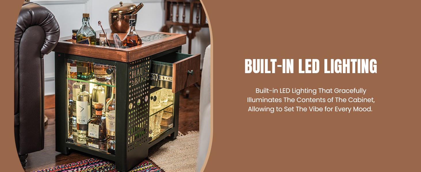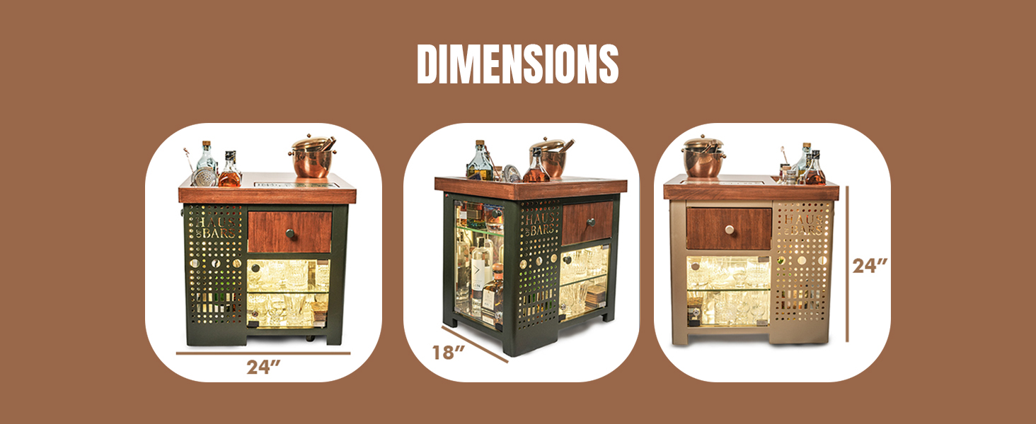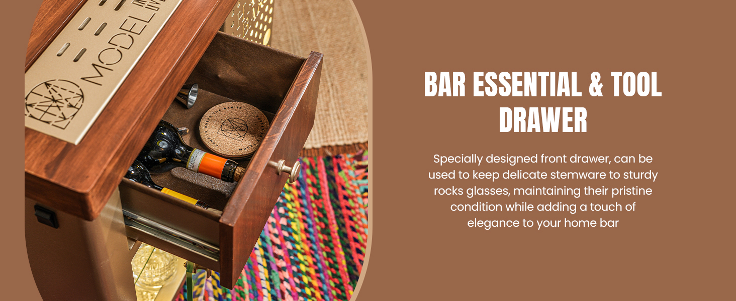 Model M comprises of a small drawer that can store bottles of wine or stem wine glassware. Below the drawer, the bar has an openable glass display storage which houses all the glassware that your may need to serve drinks. The bar top consists of a slot to keep your ice bucket and also a drip tray to make your drinks without messing the top.