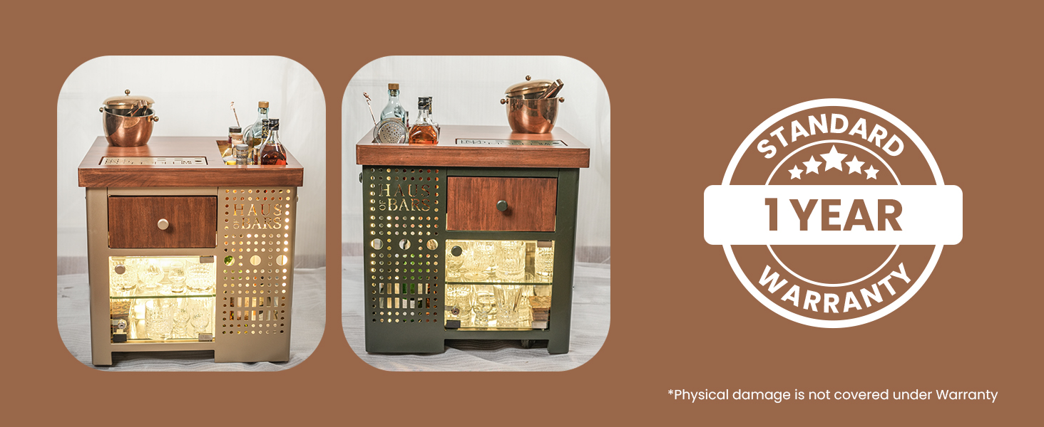Standard 1 year warranty provided on Model M Mini Bar for home, Matte Gold With Right Side Display Cabinet. Physical damage is not covered under Warranty*